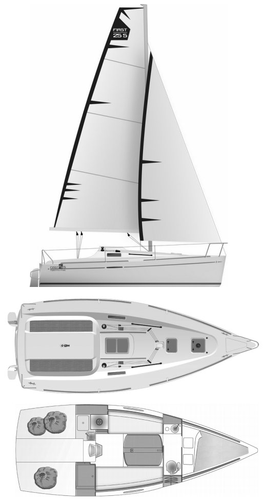 The First 25s Beneteau is a light sailboat which is a high performer. It is stable / stiff and has a low righting capability if capsized. It is best suited as a racing boat. The fuel capacity is originally very small. There is a very short water supply range.
