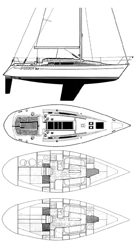 The First 345 Beneteau is a 34.5ft masthead sloop designed by Jean Beret and built in fiberglass by Beneteau between 1985 and 1988.