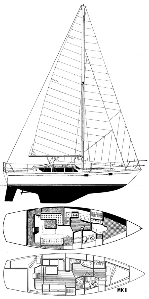 The Gulfstar 39 sailmaster is a moderate weight sailboat which is slightly under powered. It is very stable / stiff and has a good righting capability if capsized. It is best suited as a bluewater cruising boat. The fuel capacity is average. There is a good water supply range.